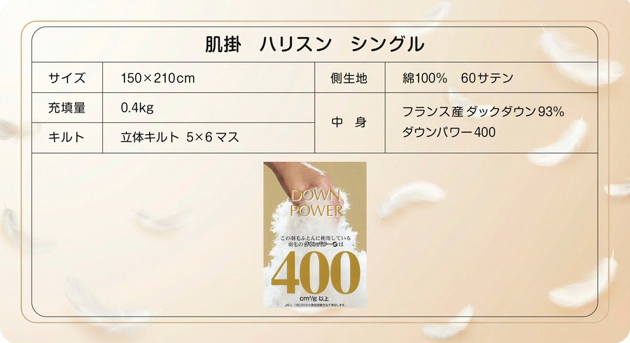 高品質なフランス産ダックダウン93%を贅沢に使用し、ダウンパワー400を実現しました。0.4kgの充実した充填量と、しなやかな60サテン生地が、身体をやさしく包み込みます。